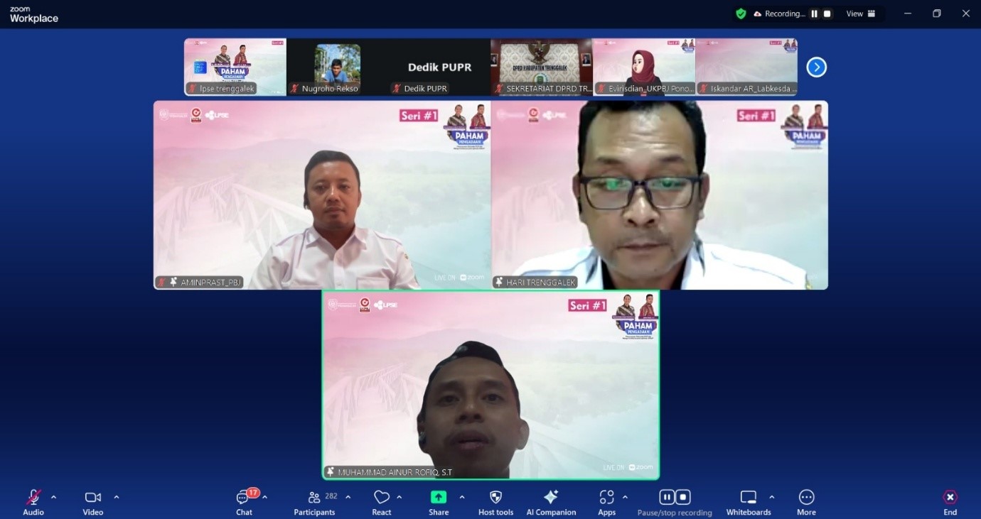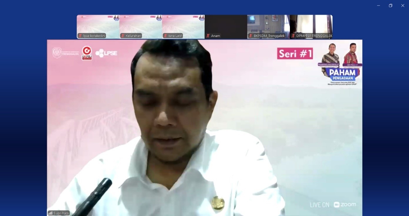 Kegiatan ini dilakukan secara daring dari kedudukan masing-masing peserta guna memudahkan aksesibilitas bagi seluruh Pejabat Pembuat Komitmen (PPK) maupun admin SiRUP di lingkungan Pemerintah Kabupaten Trenggalek. Dengan adanya seri edukasi "PAHAM PENGADAAN", diharapkan kendala teknis dalam proses pengadaan dapat diminimalisir dan kepatuhan terhadap regulasi pengadaan barang/jasa pemerintah semakin meningkat.