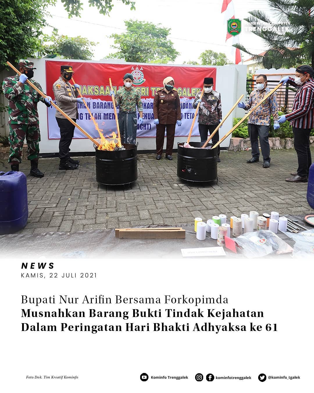Memperingati Hari Bhakti Adhyaksa ke 61, Bupati Trenggalek Mochamad Nur Arifin bersama jajaran Forkopimda musnahkan puluhan barang bukti kejahatan di halaman Kejaksaan Negerti Trenggalek